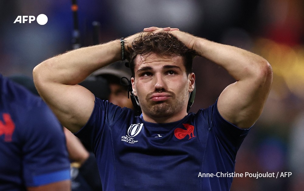 France's scrum-half and captain Antoine Dupont reacts after loosing the Rugby World Cup quarter-final match against South Africa at the Stade de France in Saint-Denis, on the outskirts of Paris, on October 15, 2023.