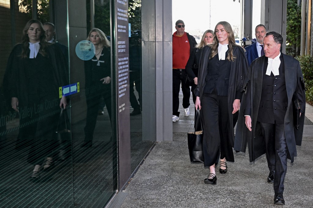Me Colin Mandy (photo 1), avocat principal, est encerclé par les médias à sa sortie du tribunal de Latrobe Valley, à Morwell, le 7 juillet 2025. © William West / AFP