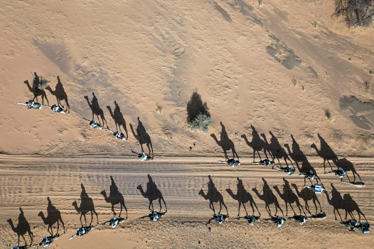 « Cette photo prise par drone a été réalisée lors d'une patrouille avec des membres de l'unité de Garde nationale méhariste dans la région de Hodh Ech Chargui, en avril 2025. Nous les avions rencontrés la veille et avions passé la nuit dans leur camp avant de partir en patrouille tôt le matin. Nous avions emporté le drone avec nous car nous voulions montrer l'immensité de la zone qu'ils patrouillent. Il était tôt et le soleil n'avait pas fini de se lever, créant des ombres allongées des soldats montant leurs chameaux. À ce moment-là, deux unités allaient dans des directions opposées, créant ces jolis motifs. Je trouvais que les ombres illustraient bien cette idée d'une garde furtive patrouillant dans le désert, toujours en alerte. »
