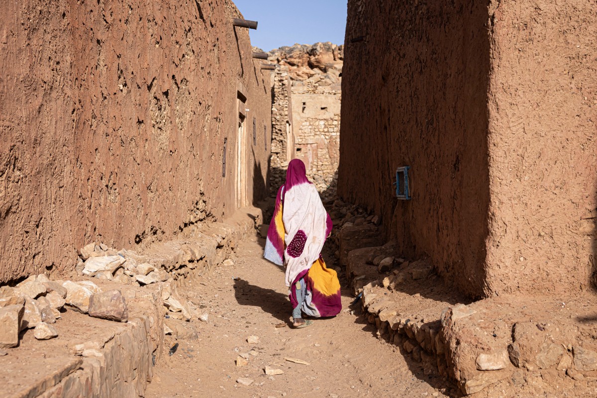 Une femme marche dans la vieille ville (1re photo), tandis qu'un fidèle musulman se rend à la mosquée avant la prière du vendredi midi (2e photo) à Oualata, le 4 avril 2025. Oualata fait partie d’un quatuor de villes anciennes fortifiées, ou « ksour », inscrites au patrimoine mondial de l’UNESCO. À leur apogée, ces villes étaient des centres commerciaux et religieux, abritant aujourd’hui des trésors datant du Moyen Âge. © Patrick Meinhardt / AFP