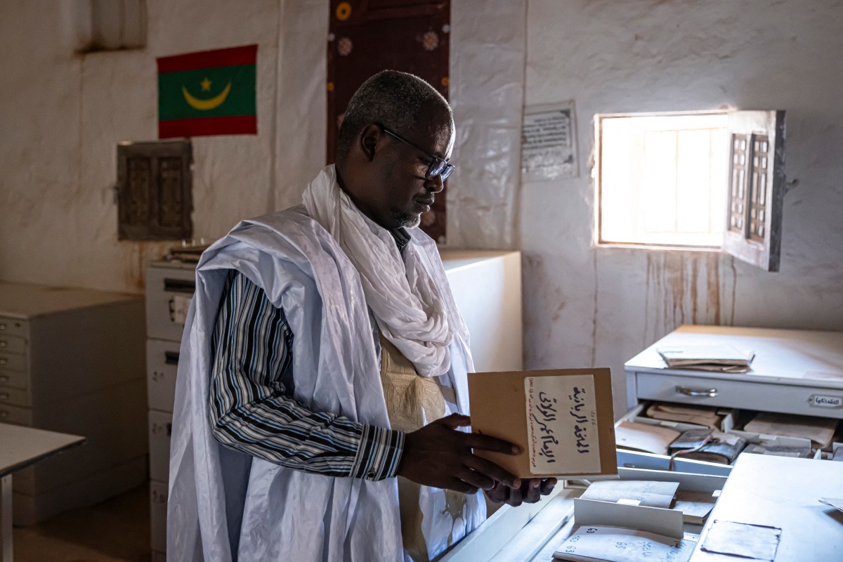 Le responsable de la bibliothèque, Mohamed Ben Baty, examine un ancien manuscrit à l’intérieur de la bibliothèque Taleb Boubacar à Oualata, le 4 avril 2025. © Patrick Meinhardt / AFP